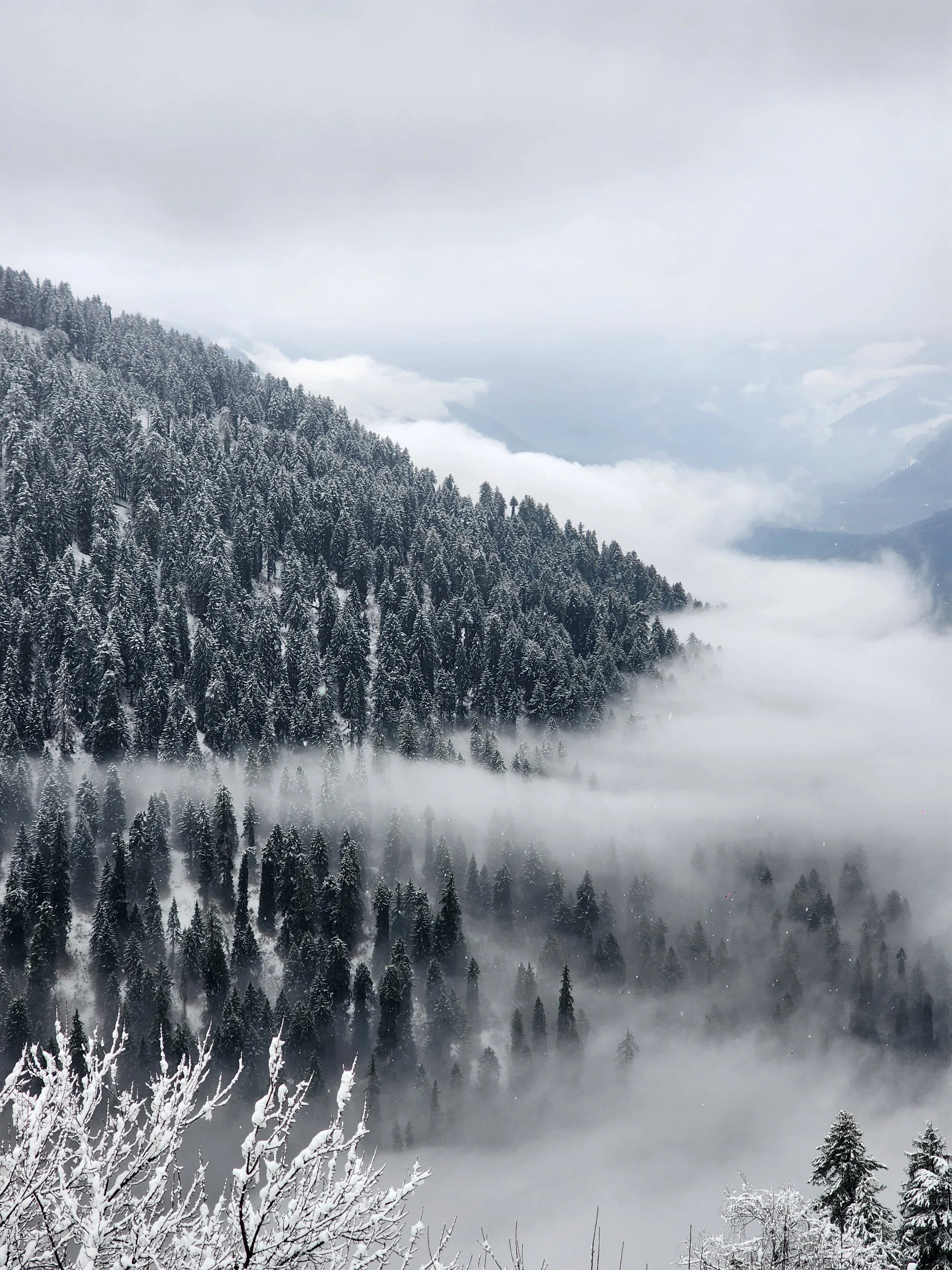 A pristine blanket of snow adorns a dense forest of pines, a stark contrast to the ethereal sea of clouds that blankets the valley below.