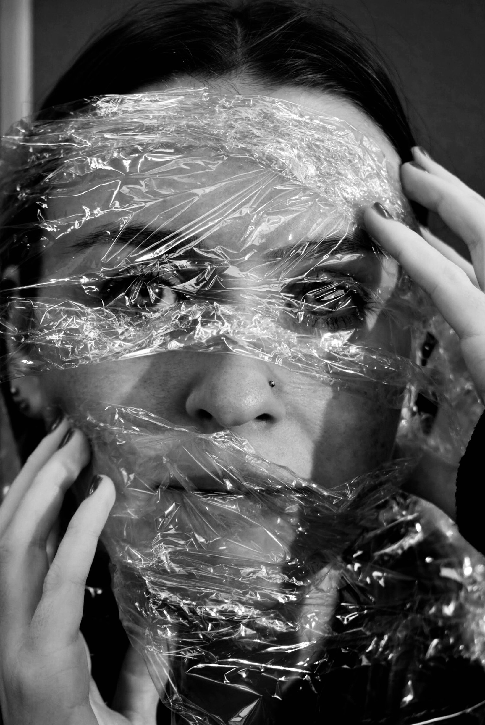 Distorted Reality - This image relates to the theme of observation as it’s looking into the effects that depression has on many people and getting the feeling of not being able to see clearly and vision being blurred as well as the fact of not being able to speak up about what your going through. Using the clingfilm to distort the face also looks into the fact of being unseen during the time of need and the feeling as is no one sees the struggles you’re going through and it going unnoticed. Distorting the image can also show a sense of being in the room but not at the same time just blended in with the background.
